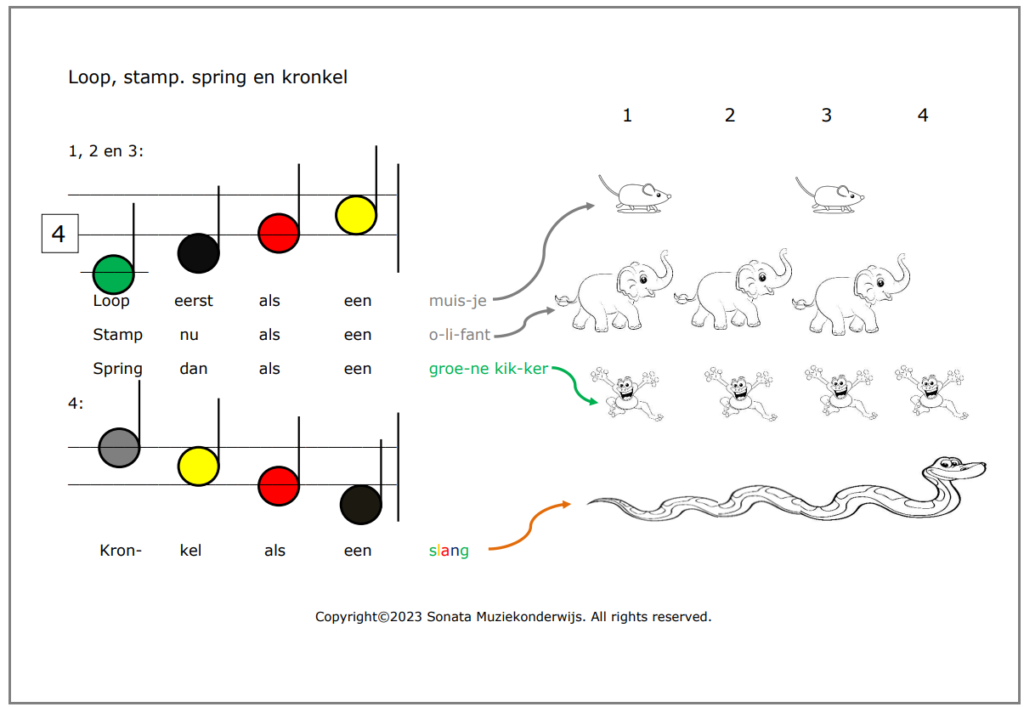 Met het lied- en speelmateriaal maken de kinderen kennis met de vormprincipes herhaling en contrast. De te spelen liedjes staan in de 4-kwartsmaat en worden genoteerd in kwartnoten en halve noten. Auditief leren de kinderen achtste noten spelen met behulp van woordritmes. Vanuit de bewegingsopdrachten leren de kinderen drie verschillende niveaus van dynamiek: piano, forte en mezzoforte. Deze woorden en bijbehorende symbolen wordt de kinderen aangeleerd.