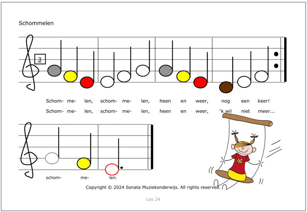 In deze cursus breidt de traditionele notatie zich uit met het aanleren van de G-sleutel en het maatteken (voor de 2-kwarts en 3-kwarts maat). De kinderen kennen uit eerdere cursussen al de begrippen maat en maatstreep. Nu leren ze ook de eindstreep en het herhalingsteken. Naast het leren lezen van het notenschrift oefenen de kinderen ook met het zelf schrijven van muzieknoten. Bij de opdracht Mijn wandelmuziek noteren de kinderen zelf ritmes met de kwartnoot, de halve noot en achtste noten. Bij het liedje Schommelen leren ze ook de gepunteerde halve noot kennen. De kinderen krijgen in deze cursus regelmatig luisteropdrachten waarmee ze hun muzikaal gehoor trainen. Ze worden gevraagd om woordritmes of korte melodietjes te herkennen, maar ook verschillen in muziek op te merken en te benoemen. De kinderen kunnen na deze cursus het speelmateriaal ritmisch correct uitvoeren en in tempo blijven. Ze leren ook hun aanslag op het klokkenspel te verfijnen tot zacht, sterk, puntig en gebonden spelen. Met deze articulatievormen (non legato en legato, staccato en marcato) in combinatie met dynamiek (forte en piano) kunnen de kinderen expressie toevoegen aan hun spel.